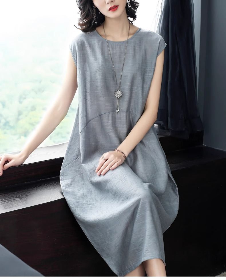 【好評如潮!全台免運!】收腰抽繩顯瘦棉麻中長款連衣裙