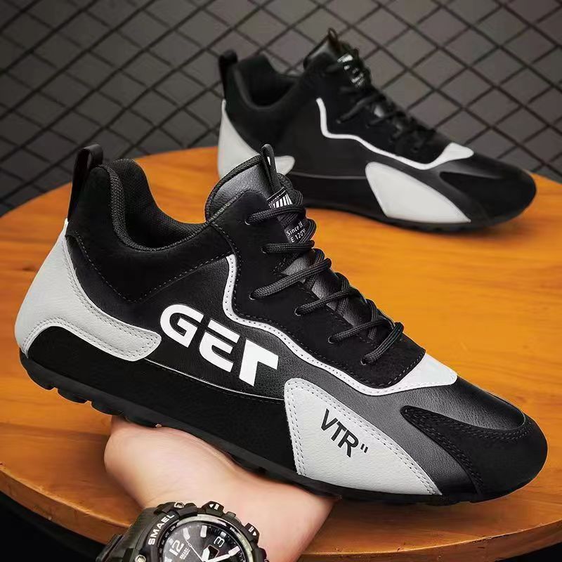【透氣百搭】春季韓版復古潮流皮面防滑男士跑鞋【黑色】一雙