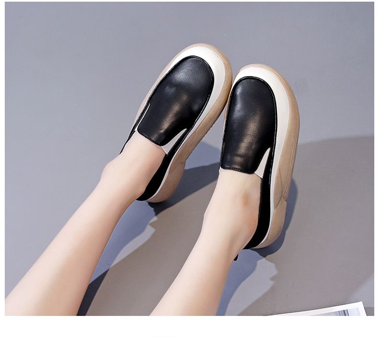 【純色皮革】女士一腳蹬厚底增高休閒小皮鞋【黑色】一雙