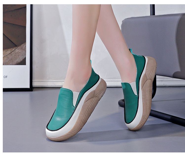 【純色皮革】女士一腳蹬厚底增高休閒小皮鞋【綠色】一雙