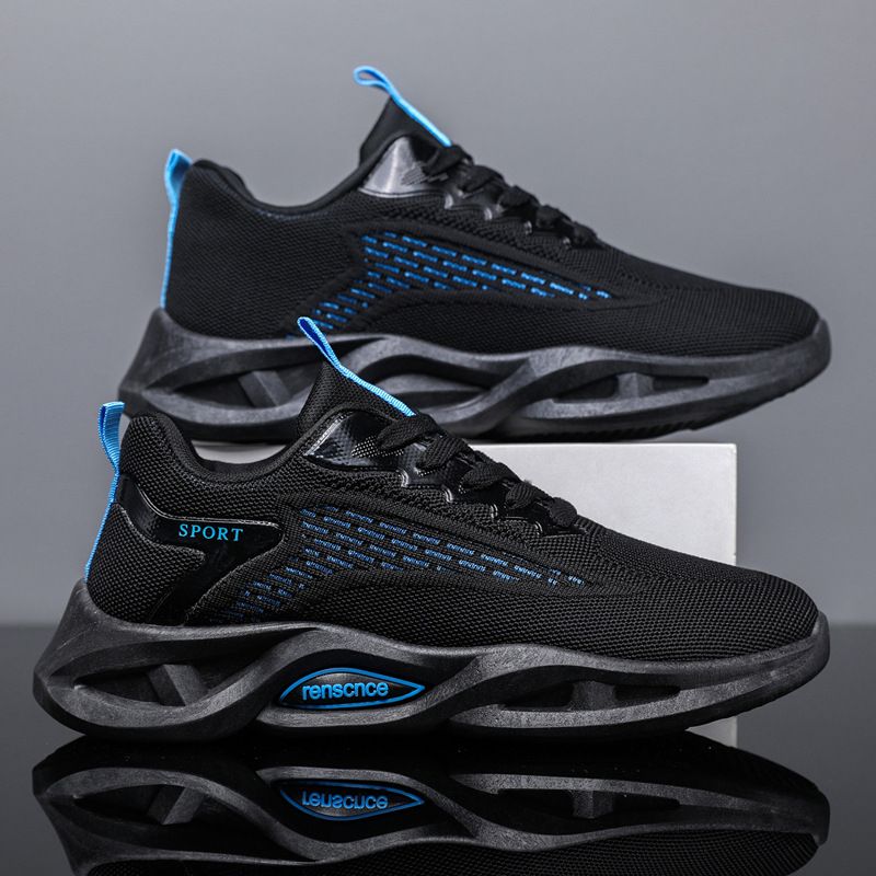 【隨風而行,輕快爽跑】男士飛織鞋面輕盈柔軟運動鞋【黑藍色】一雙