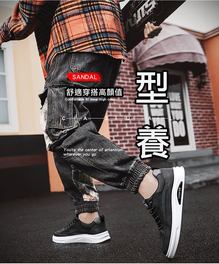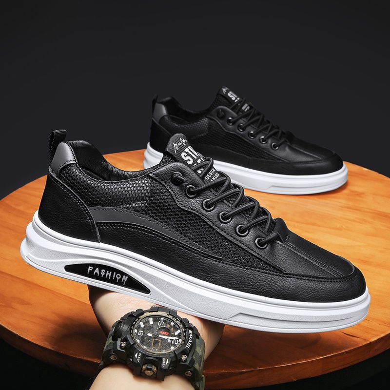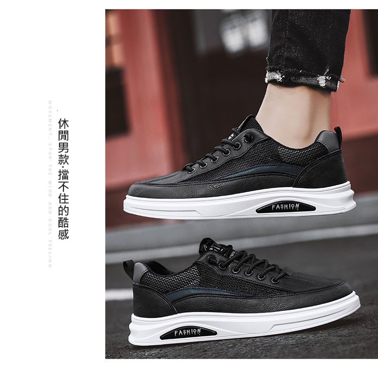 【透光透氣百搭】春季新款男士皮革網布運動鞋【黑色】一雙