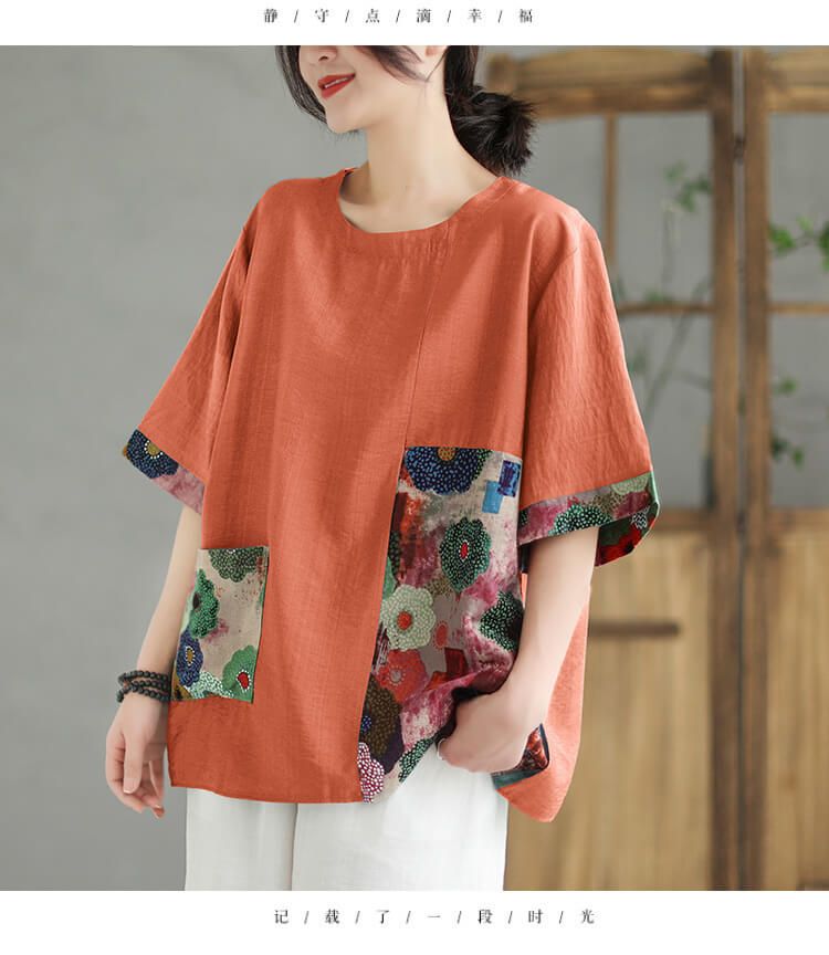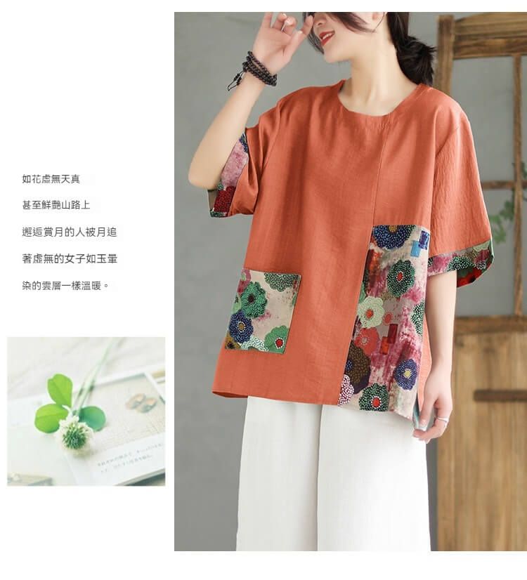 印花拼色大碼寬鬆棉麻上衣【桔紅色】+【湖藍色】各一件(到手兩件,每件均價549元)