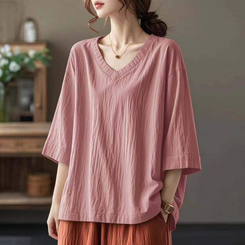 七分袖V領棉麻大碼女士T恤【買一送一】粉色+杏色各一件(到手2件!每件均價499元!)