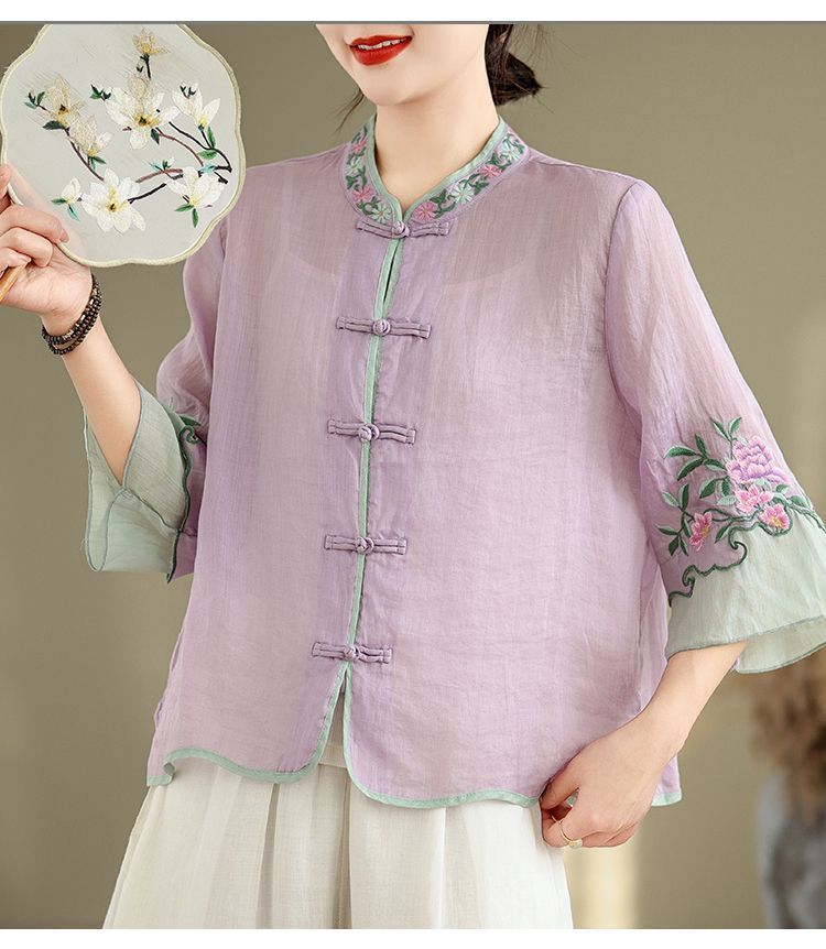 盤扣復古拼色棉麻立領刺繡七分袖上衣【買一送一】【粉色】+【紫色】各一件(到手兩件,每件均價649元)