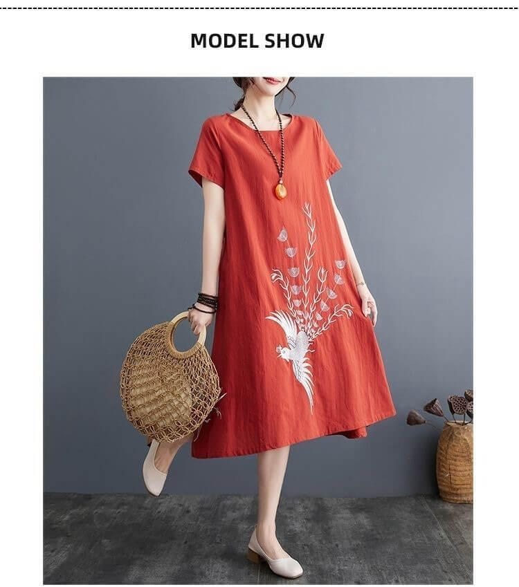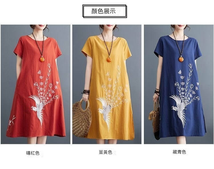 夏季遮肚顯瘦刺繡短袖連衣裙【紅色】+【黃色】各一件(到手兩件,每件均價549元)