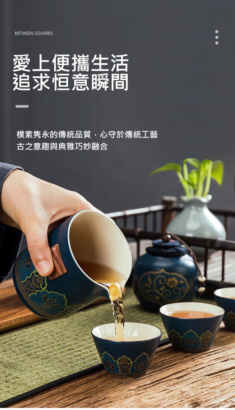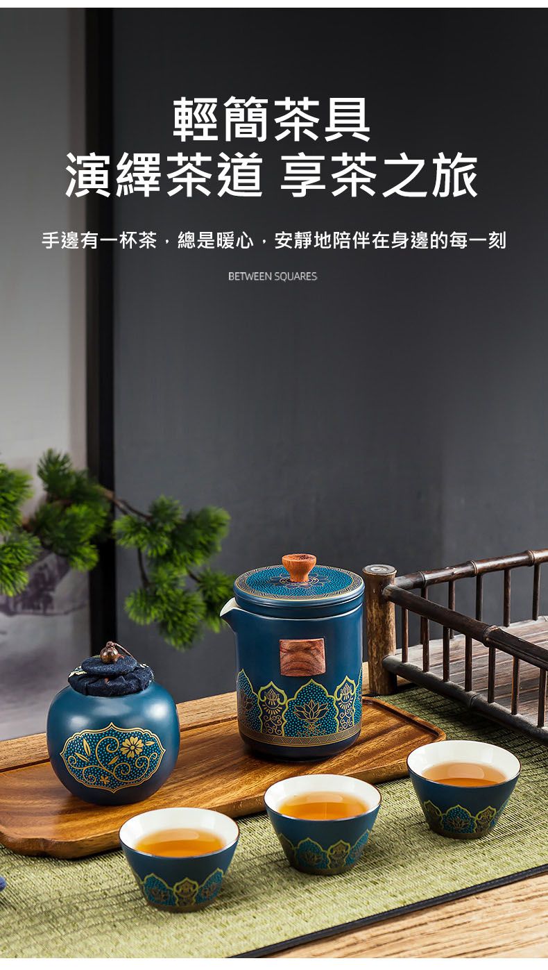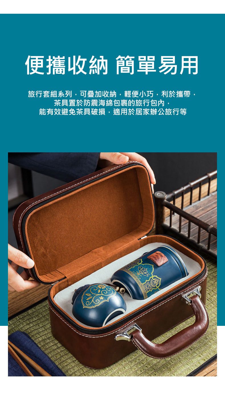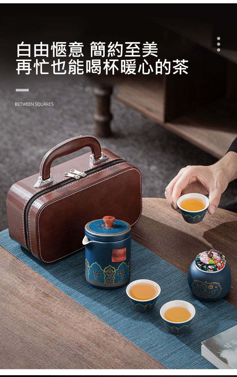 復古茶具套裝【藍色】一組(一壺三杯+茶葉罐+手提皮包)