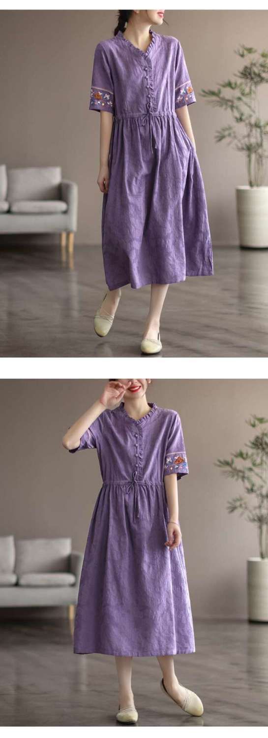 收腰抽繩顯瘦棉麻中長款連衣裙【加400元得2件!】【紫色】+【藍色】各一件