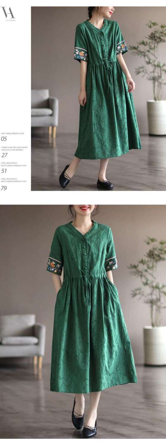 收腰抽繩顯瘦棉麻中長款連衣裙【綠色】一件