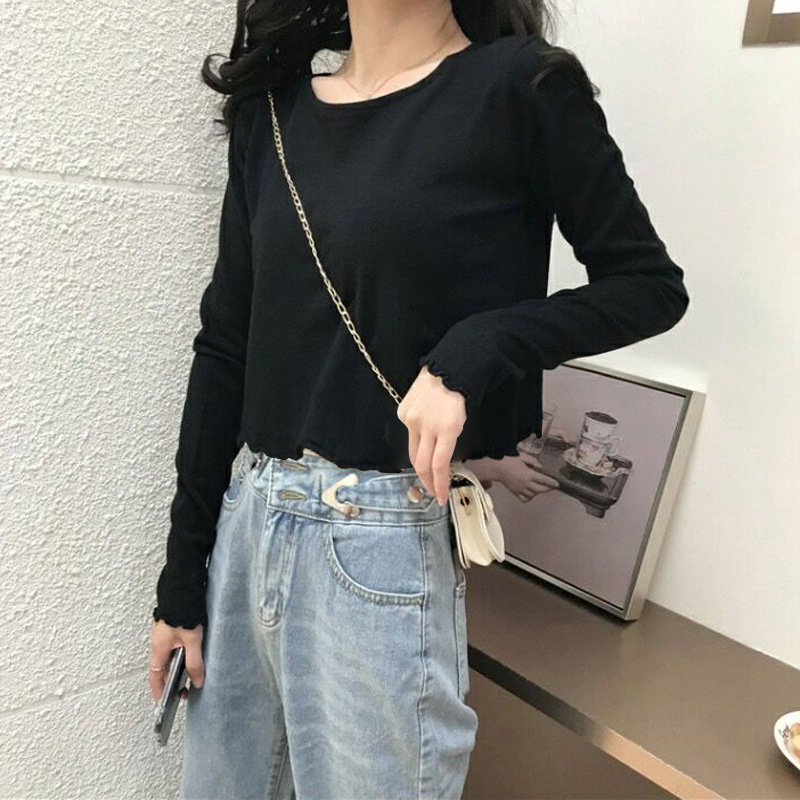 木耳邊韓版修身高彈長袖上衣【買一送一】白色+黑色各一件(到手2件!每件均價400元!)