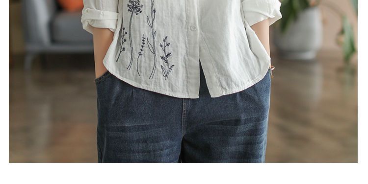 純棉簡約花卉刺繡長袖襯衣【買一送一】【白色】+【藍色】各一件(到手兩件,每件均價549元)