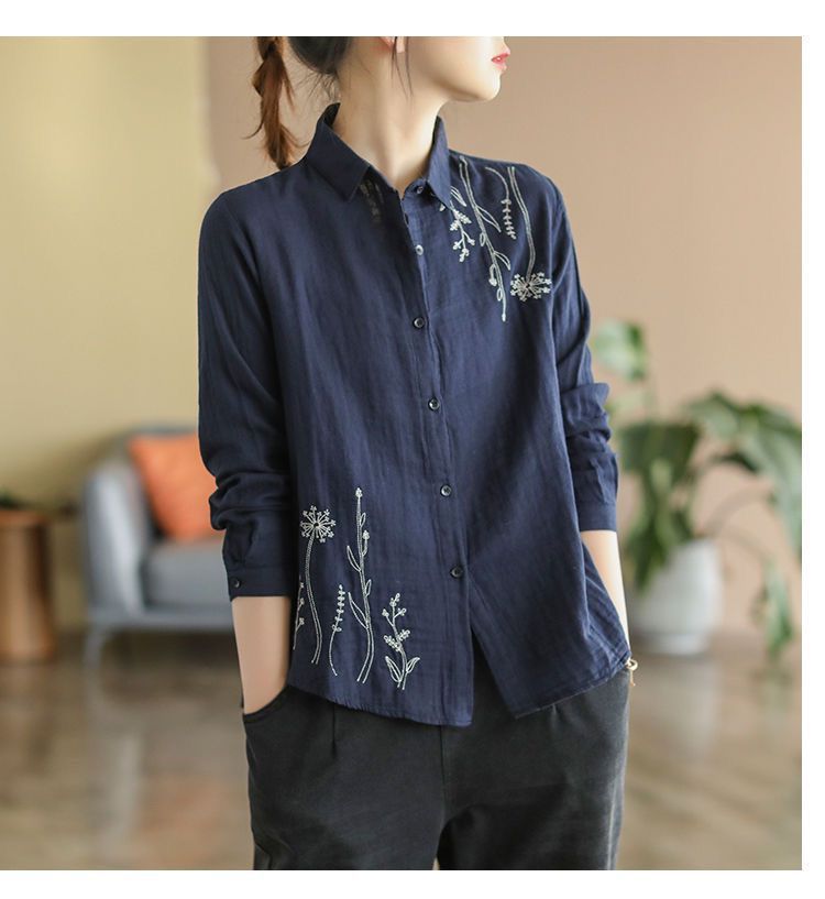 純棉簡約花卉刺繡長袖襯衣【買一送一】【藍色】兩件(到手兩件,每件均價549元)