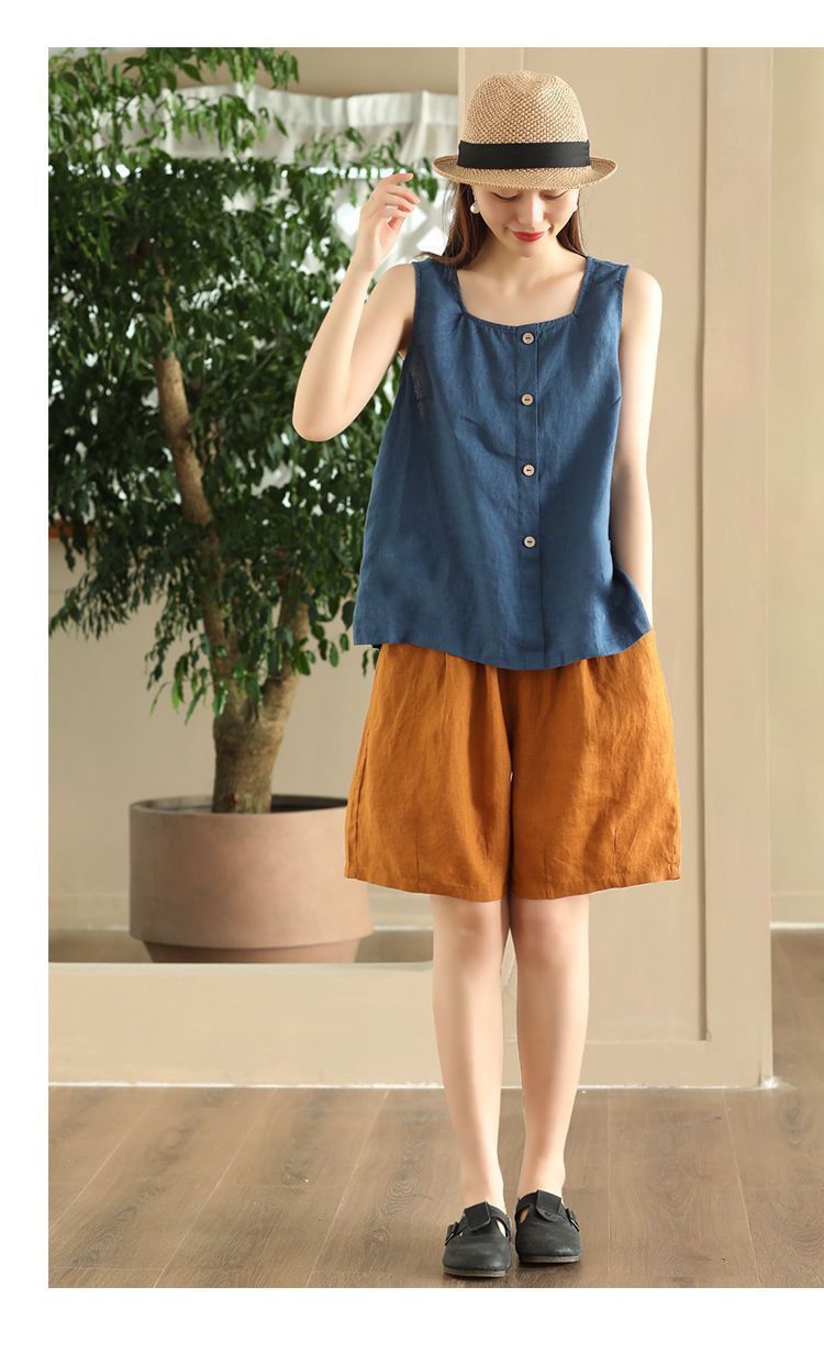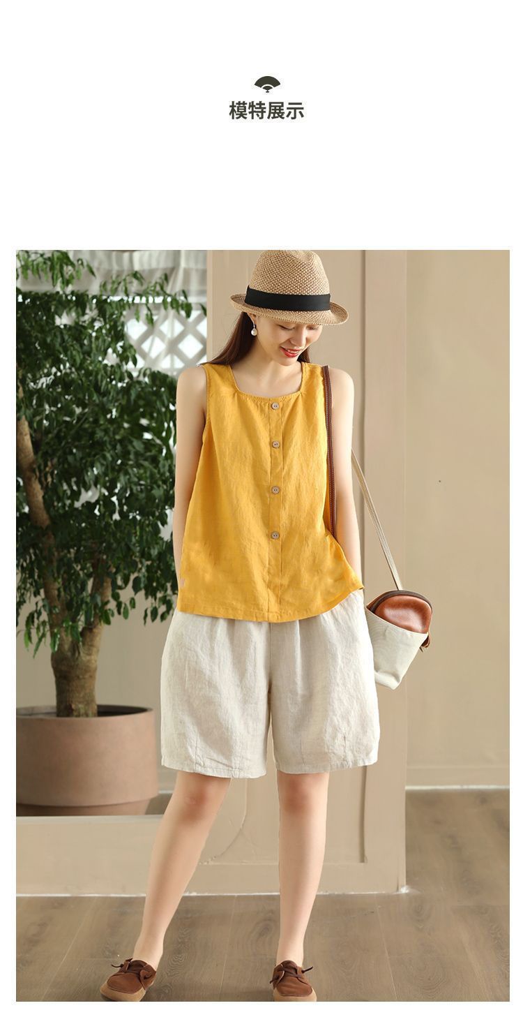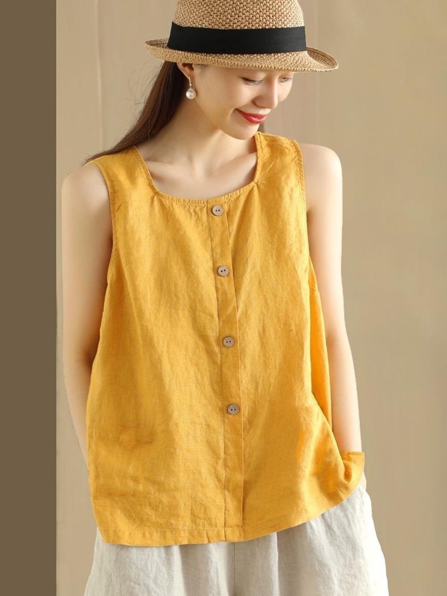 簡約鈕扣裝飾棉麻無袖T恤【買一送二】黃色+咖色+藍色各一件(到手3件!每件均價333元!)