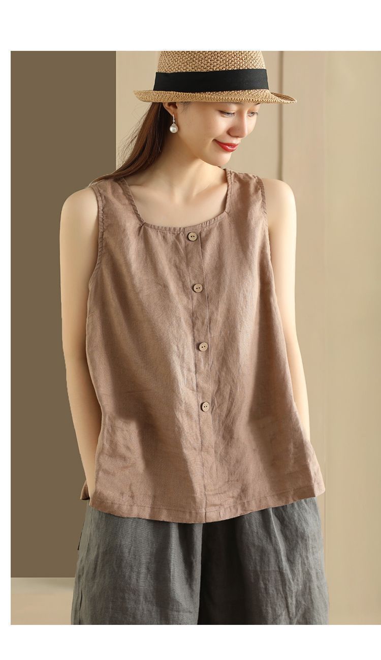 簡約鈕扣裝飾棉麻無袖T恤【買一送二】咖色兩件+藍色一件(到手3件!每件均價333元!)