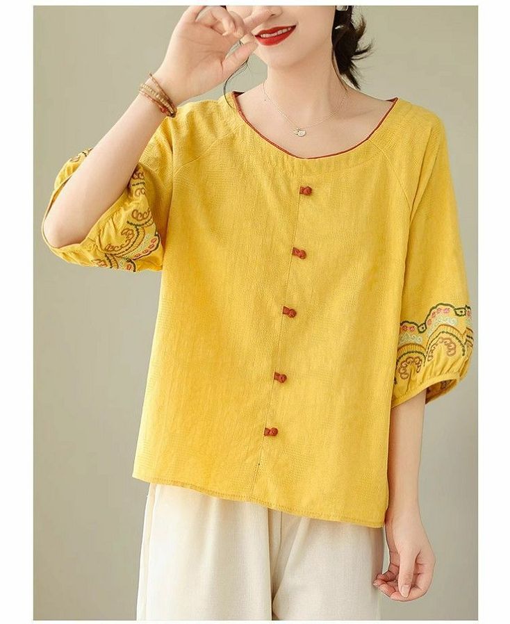 簡約淡雅棉麻半袖刺繡上衣【買一送一】【黃色】+【紅色】各一件(到手兩件,每件均價649元)