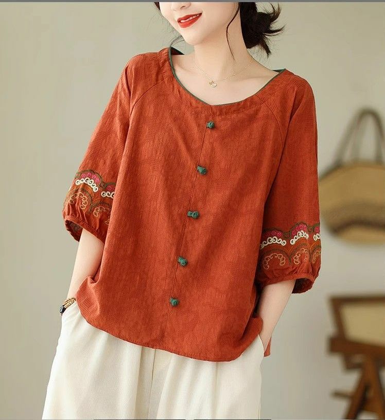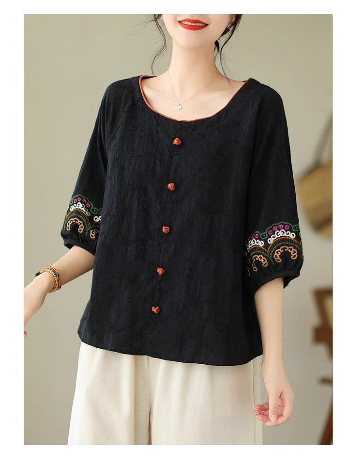 簡約淡雅棉麻半袖刺繡上衣【買一送一】【紅色】+【黑色】各一件(到手兩件,每件均價649元)