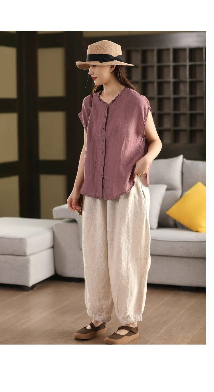 涼快寬鬆花邊領紐扣棉麻上衣【煙紫色】+【麻本色】各一件(到手兩件,每件均價549元)