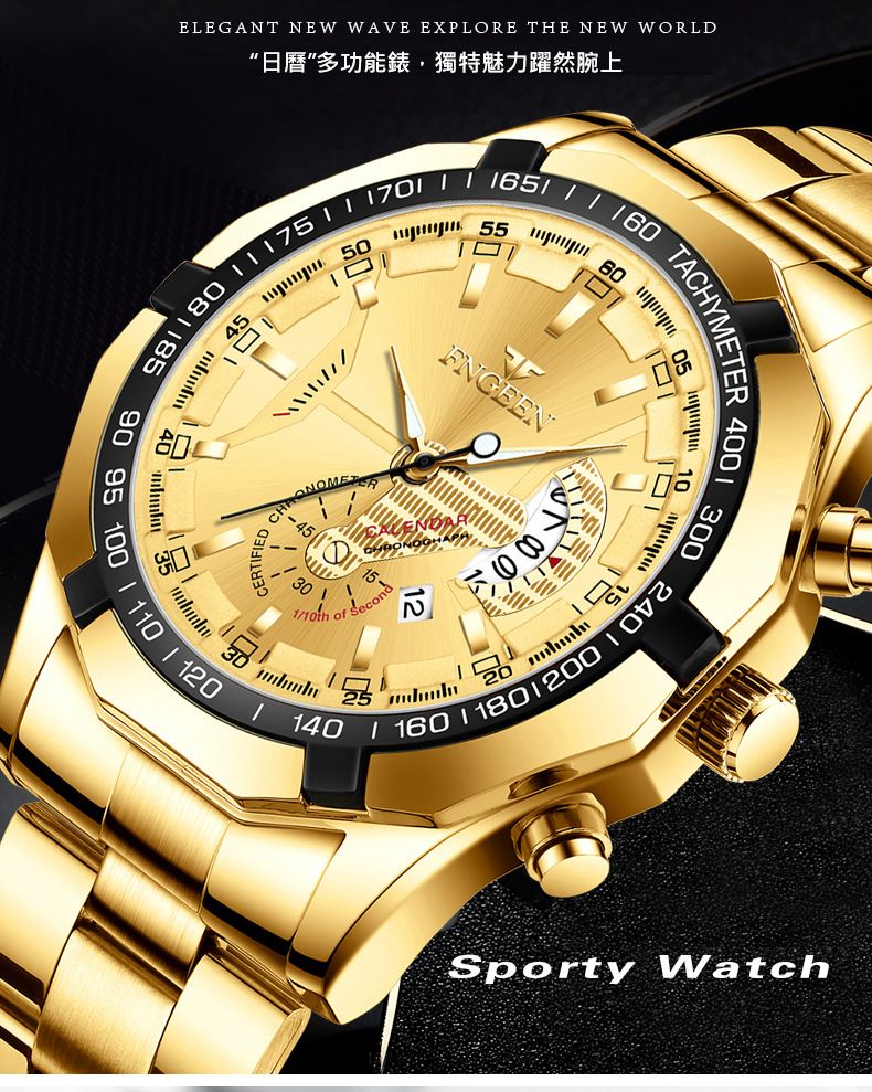 【美學新風尚】超大新日曆大錶盤男士手錶【全金金面】一塊