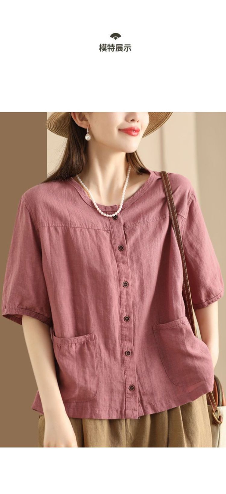 口袋設計復古氣質棉麻襯衫【粉色】+【綠色】各一件(到手兩件,每件均價499元)