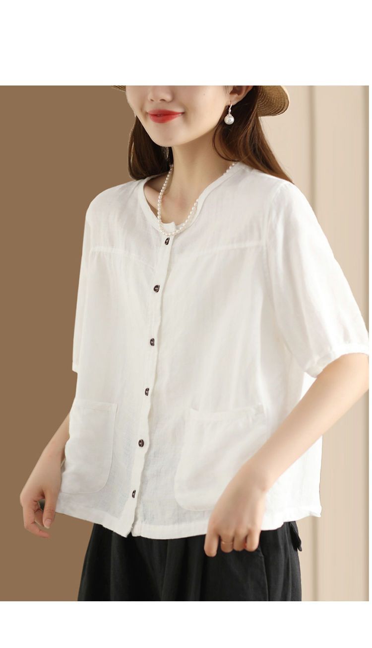 口袋設計復古氣質棉麻襯衫【白色】+【黑色】各一件(到手兩件,每件均價499元)