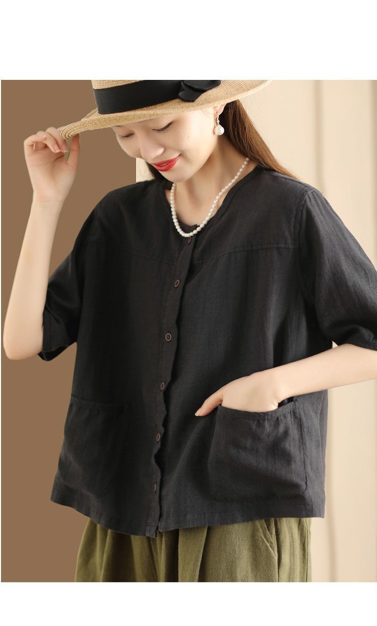 口袋設計復古氣質棉麻襯衫【黑色】+【卡其色】各一件(到手兩件,每件均價499元)