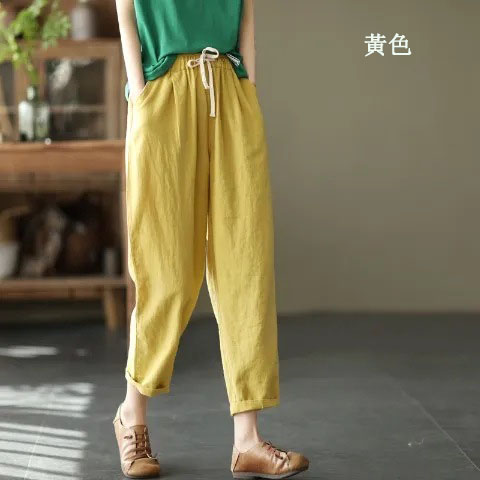 棉麻復古寬鬆純色百搭休閒九分褲【買一送一】【黃色】+【森林綠】各一件(到手兩條,每條均價549元)
