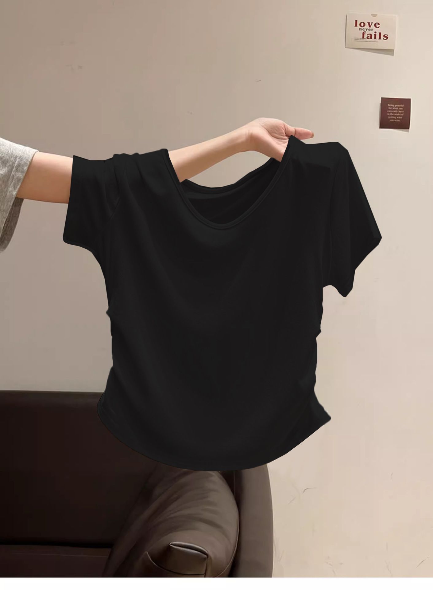 夏季短款褶皺收腰顯瘦高級V領T恤【買一送二】黑色+白色+黃色各一件(到手3件!每件均價333元!)