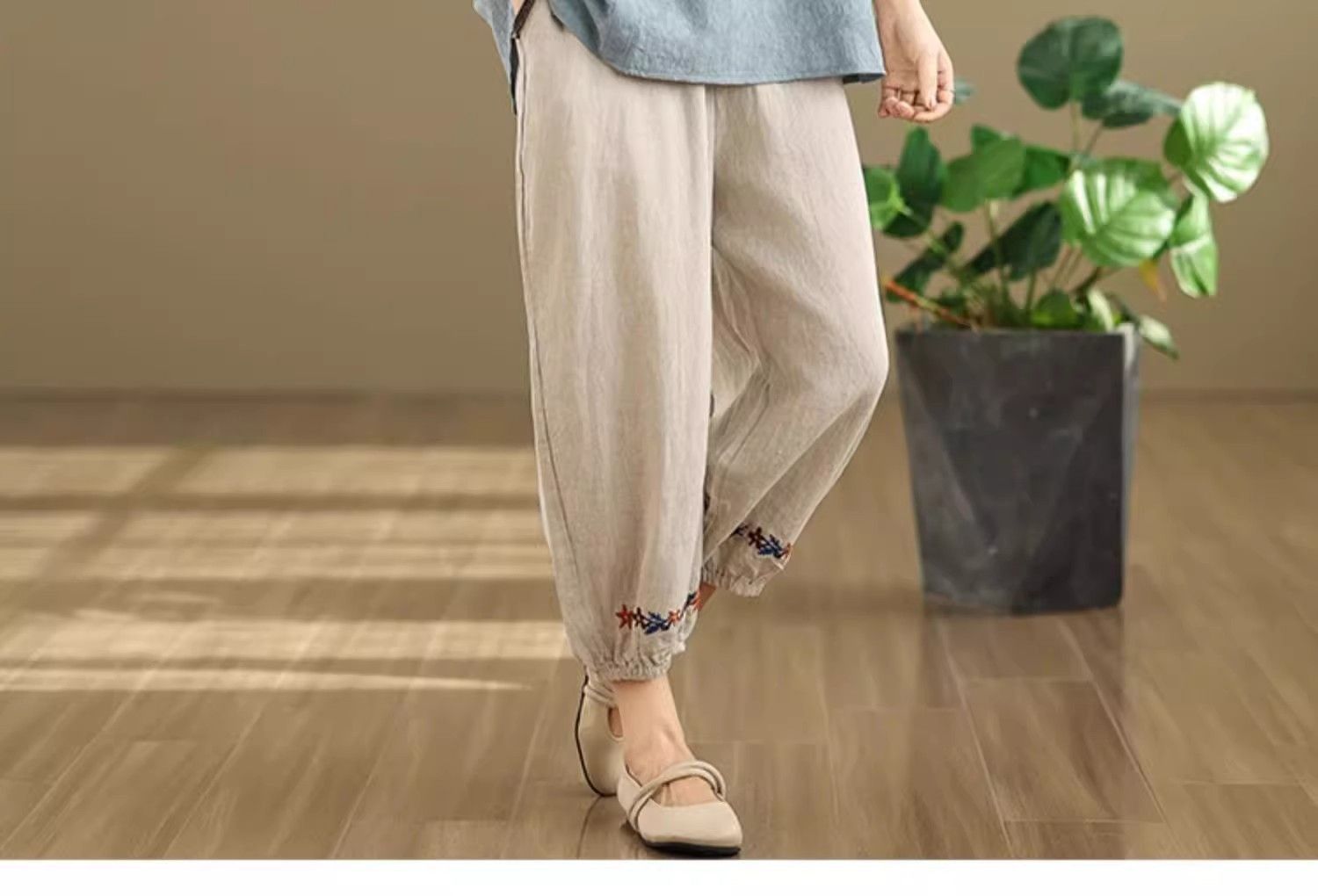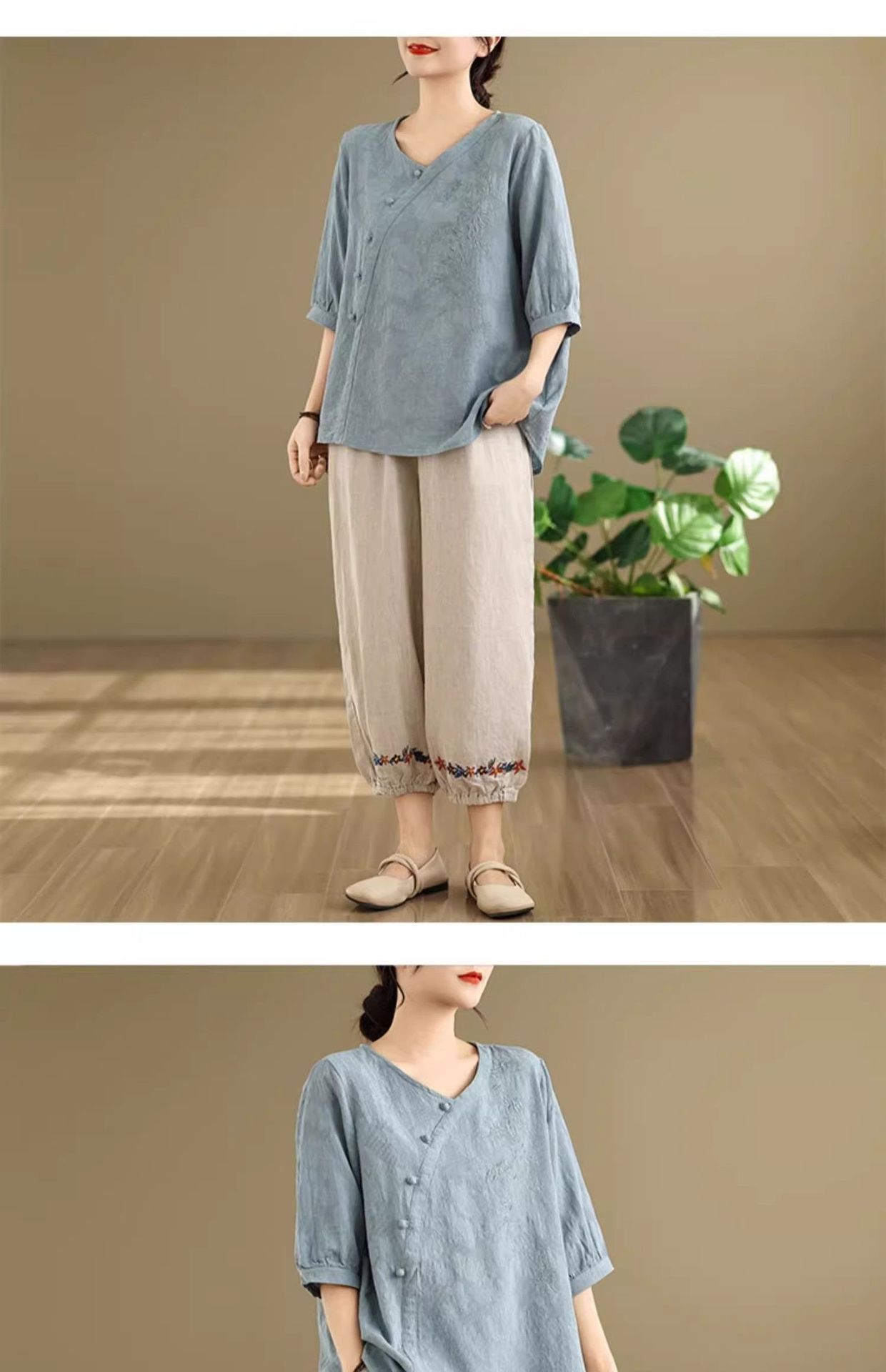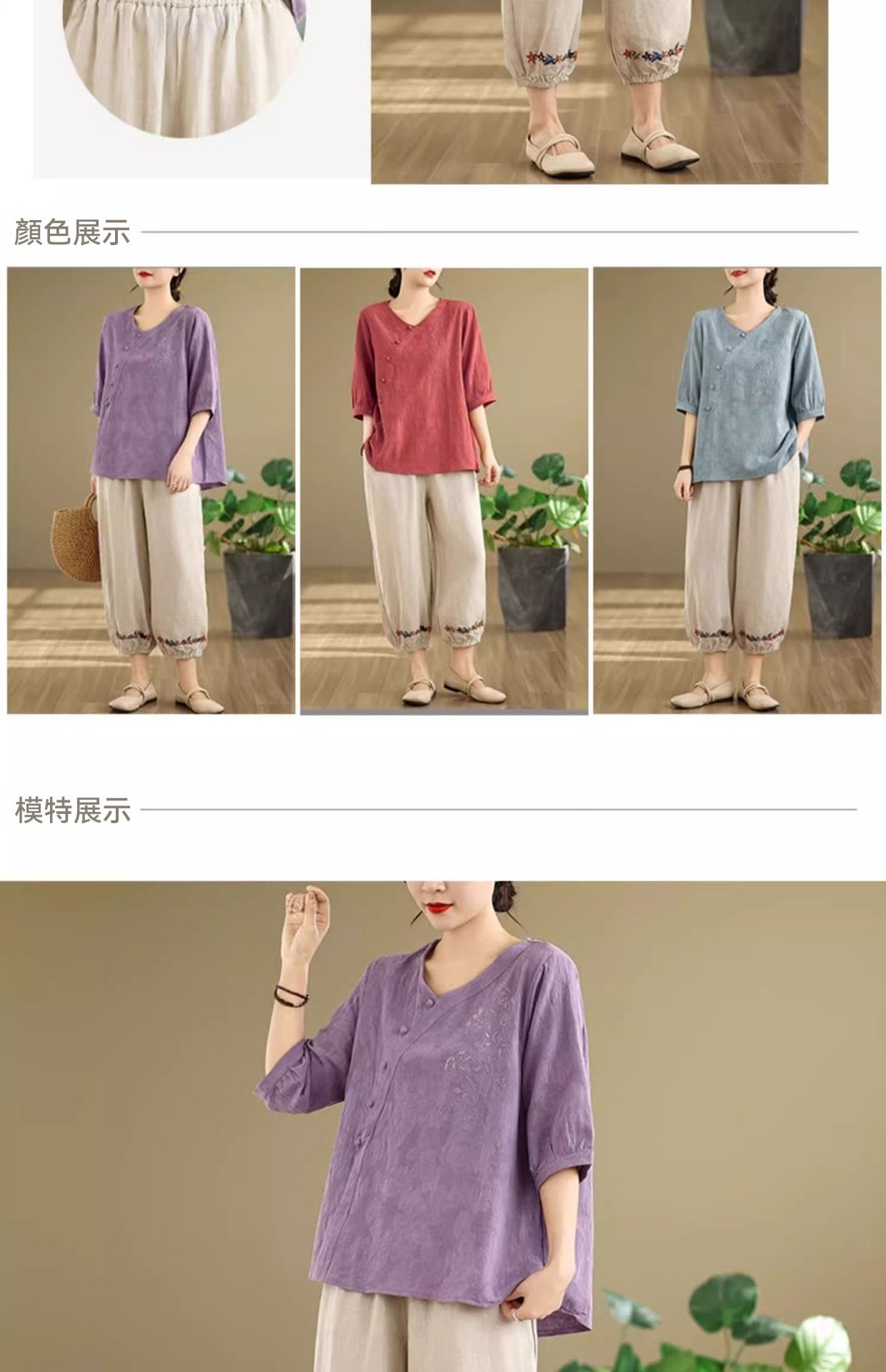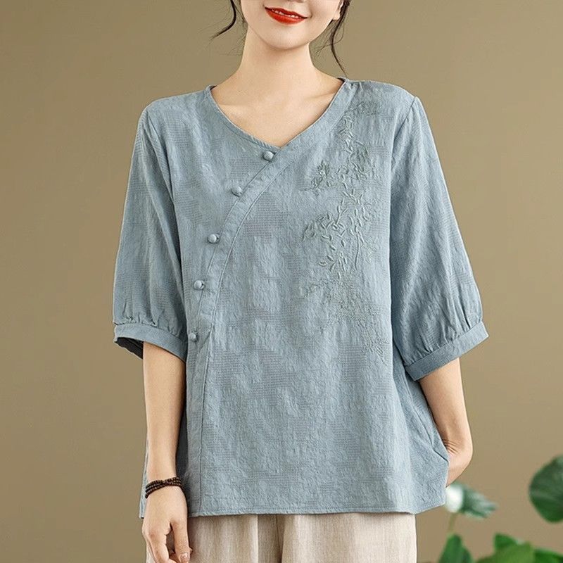 新中式媽媽棉麻刺繡上衣【買一送一】【藍色】+【紫色】各一件(到手兩件,每件均價649元)