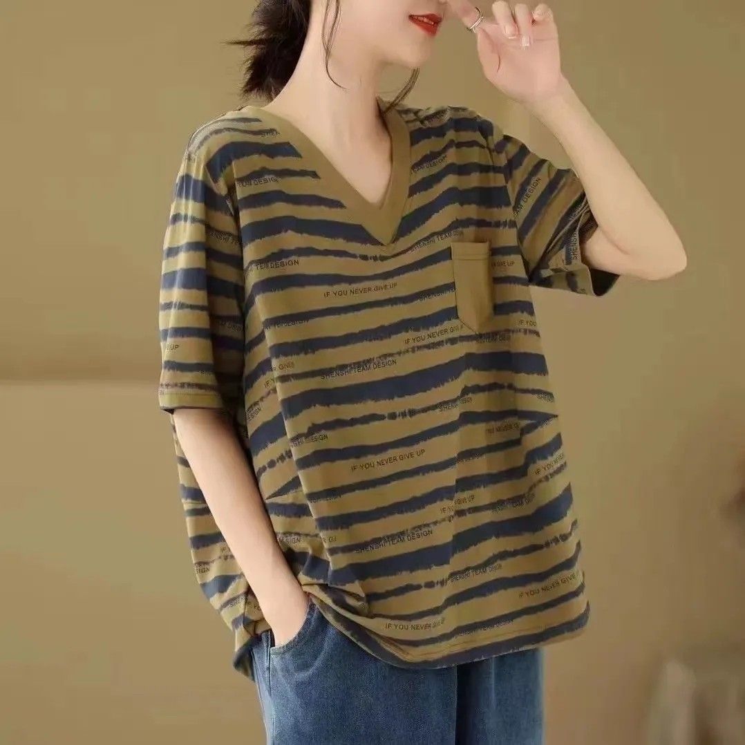 【寬鬆顯瘦!限時買一送一!】女士文藝復古簡約條紋V領T恤