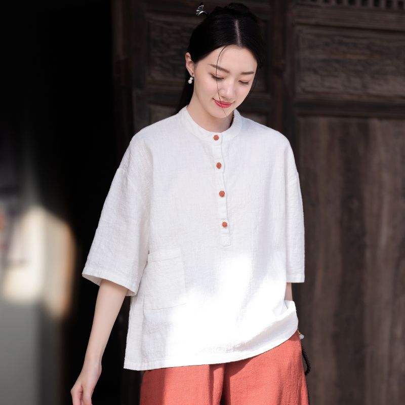 【網路熱銷!限時特惠買一送一!】立領純色休閒百搭紐扣裝飾棉麻上衣