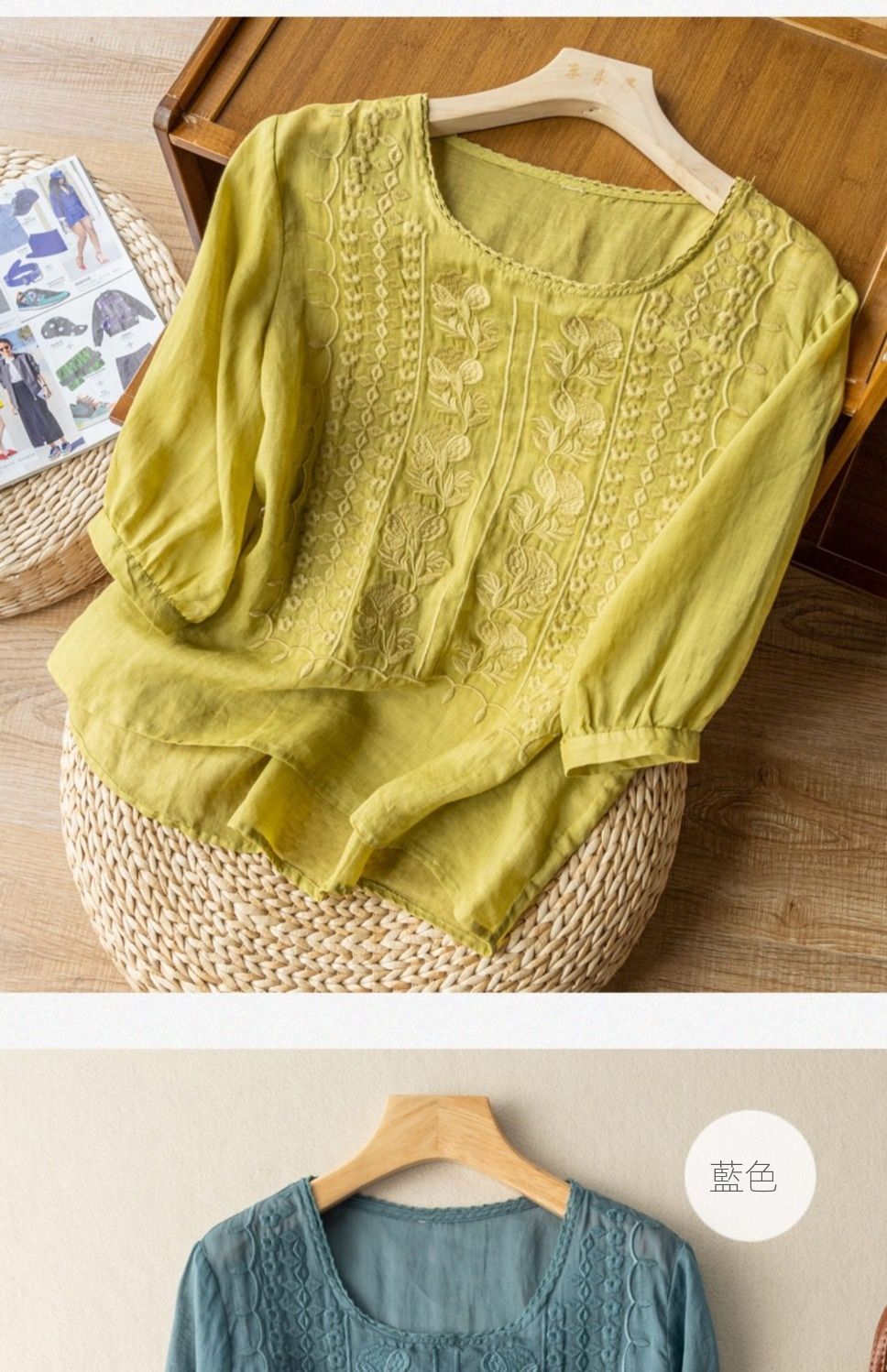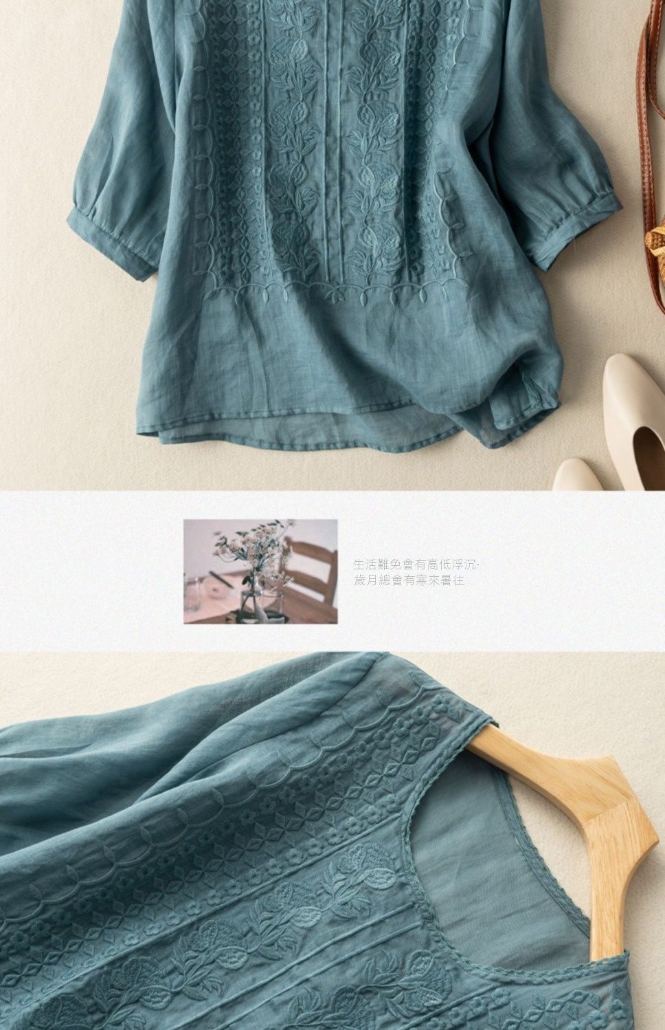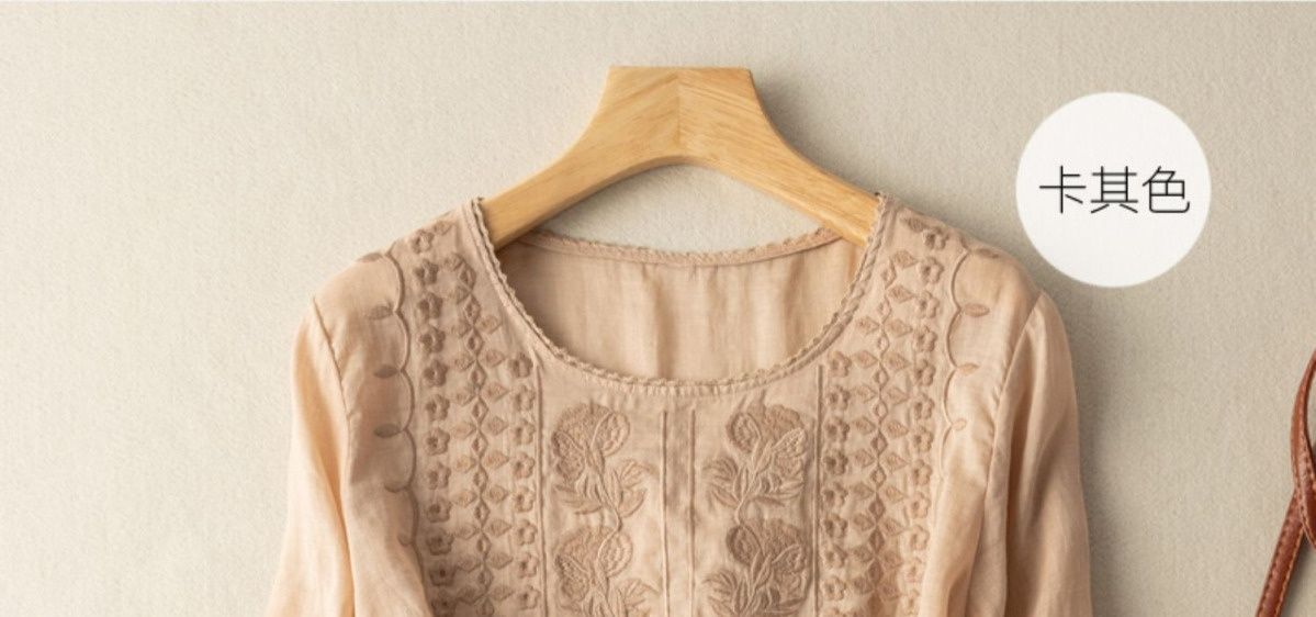 刺繡復古女士中袖上衣【買一送一】【藍色】+【卡其色】各一件(每件低至649元)