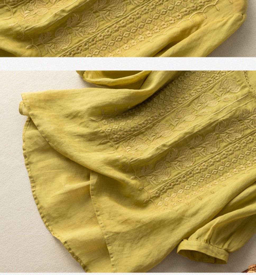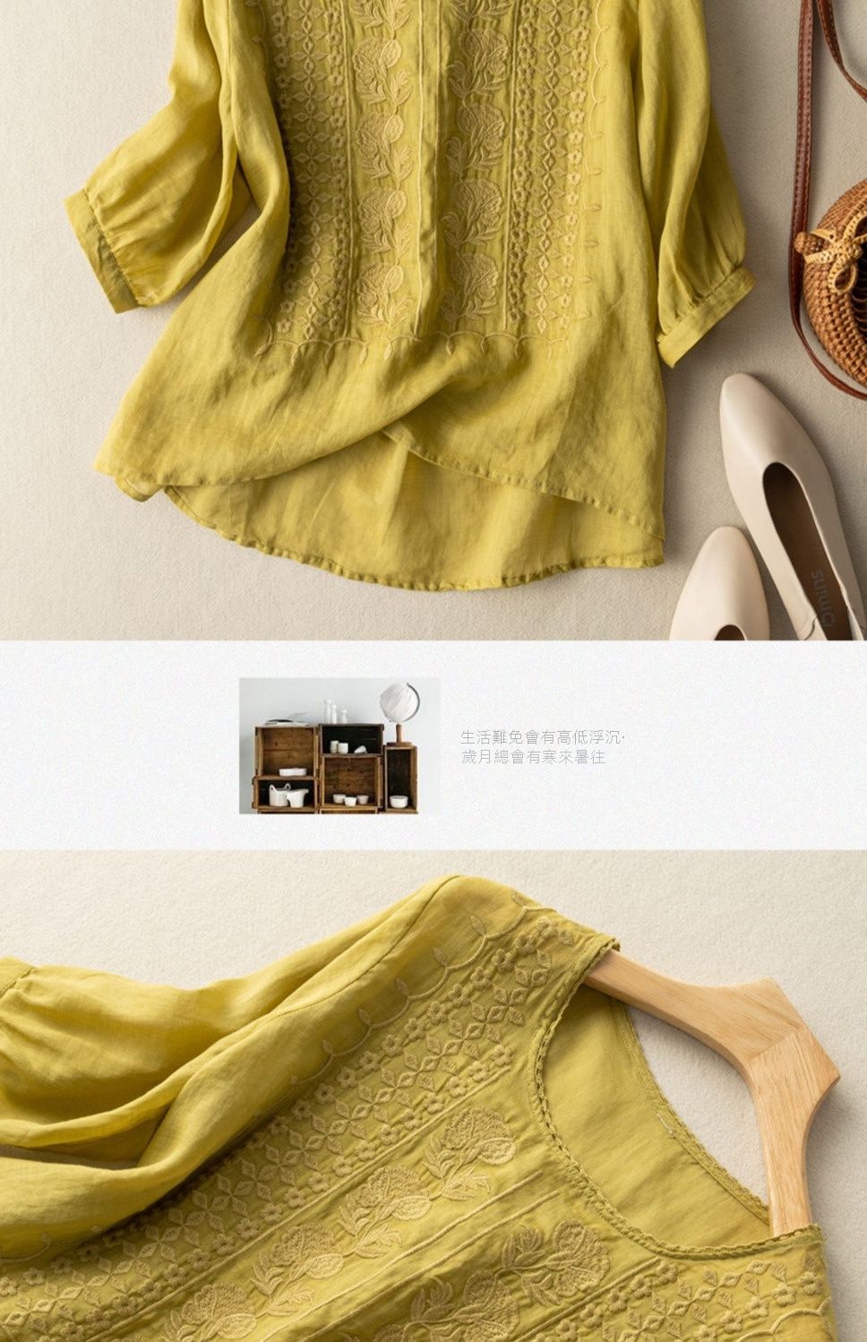 刺繡復古女士中袖上衣【買一送一】【黃色】+【卡其色】各一件(每件低至649元)