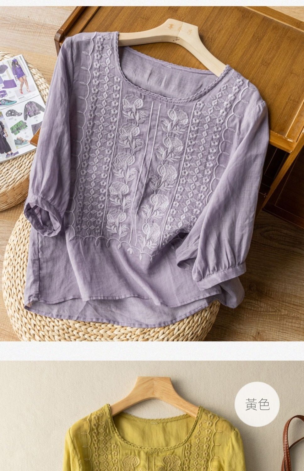 刺繡復古女士中袖上衣【買一送一】【黃色】+【紫色】各一件(每件低至649元)
