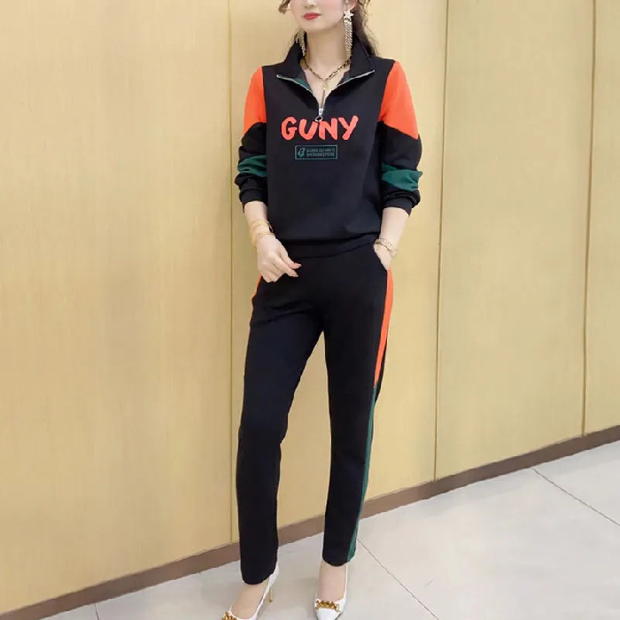 字母印花休閒衛衣長褲兩件套【黑色】一套
