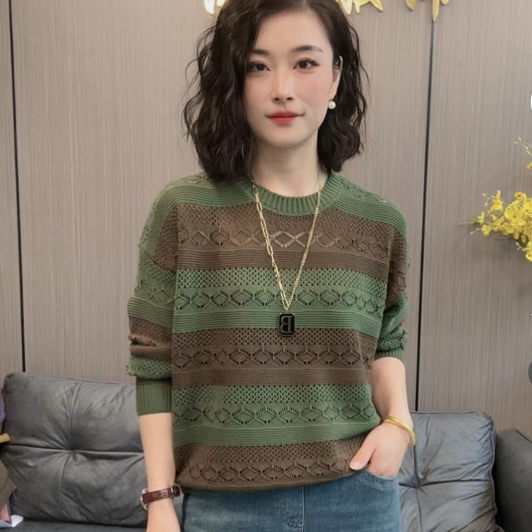 暢銷時尚條紋拼接百搭針織衫【買一送一】綠色+米色各一件(到手兩件,每件549元!)
