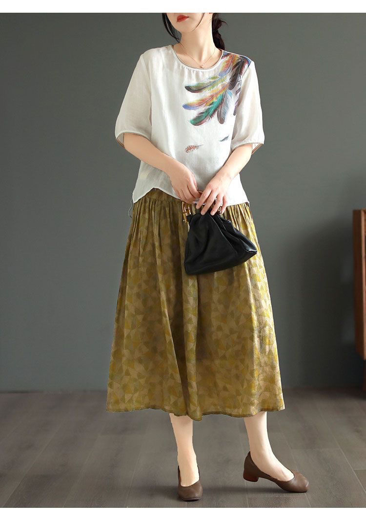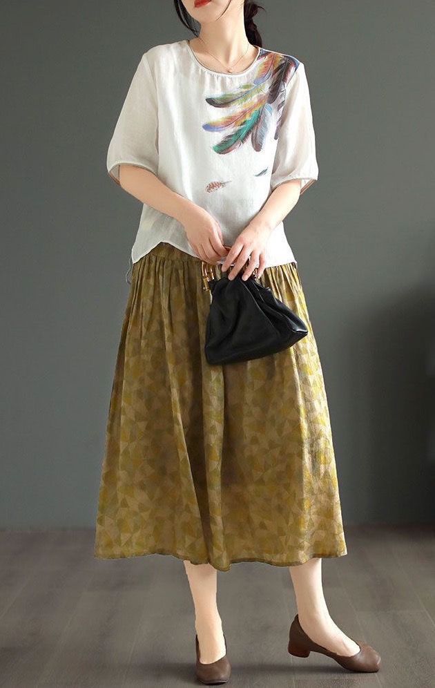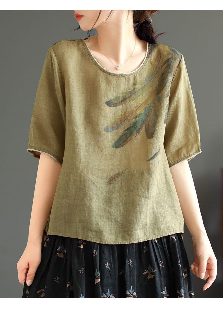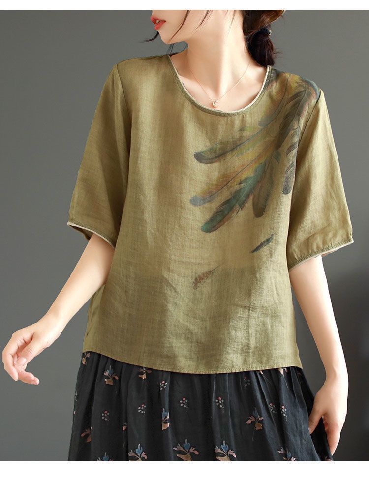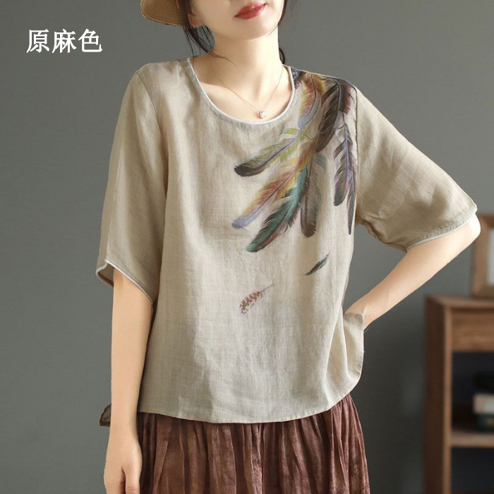 復古印花高端棉麻T恤【秒殺4件】原麻色+禪綠色+象牙白+藕色各一件(每件399元)