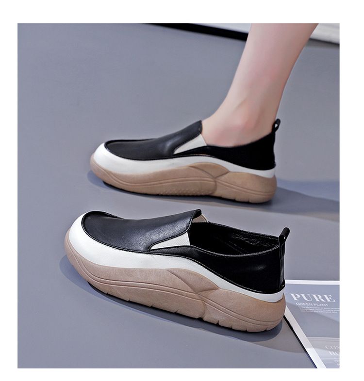 【純色皮革】女士一腳蹬厚底增高休閒小皮鞋【黑色】一雙