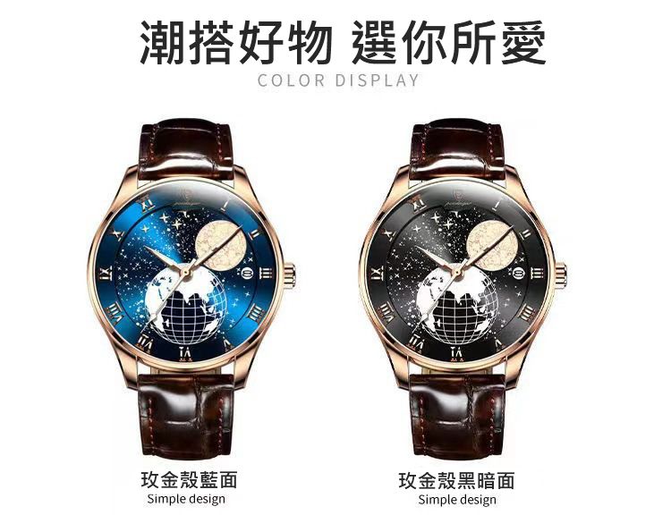 超薄日曆款防水夜光男士手錶【玫金殼藍面】+【玫金殼黑面】各一組(優惠400)