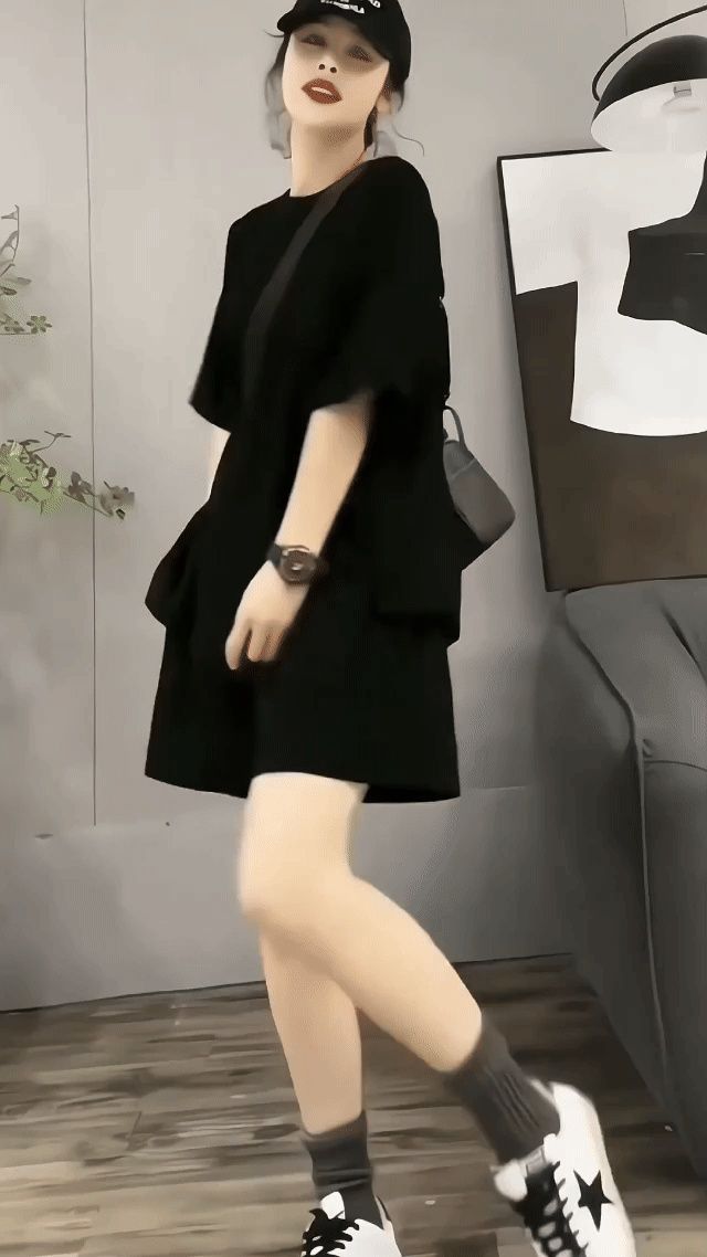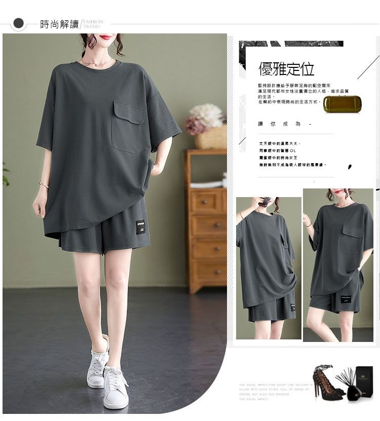口袋設計時尚女士短袖套裝【買一送一】黑色+灰色各一套(到手兩套,每套均價549元)
