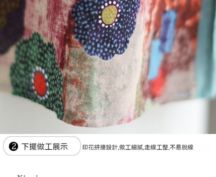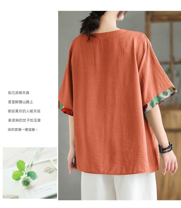 印花拼色大碼寬鬆棉麻上衣【桔紅色】+【湖藍色】各一件(到手兩件,每件均價549元)