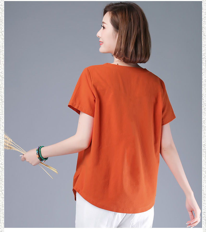棉麻復古風短袖女士T恤【買一送一】藍色+橘色各一件(到手2件!每件均價549元!)