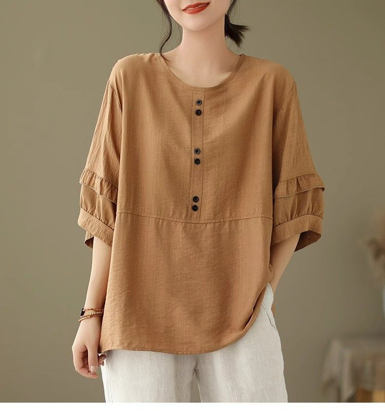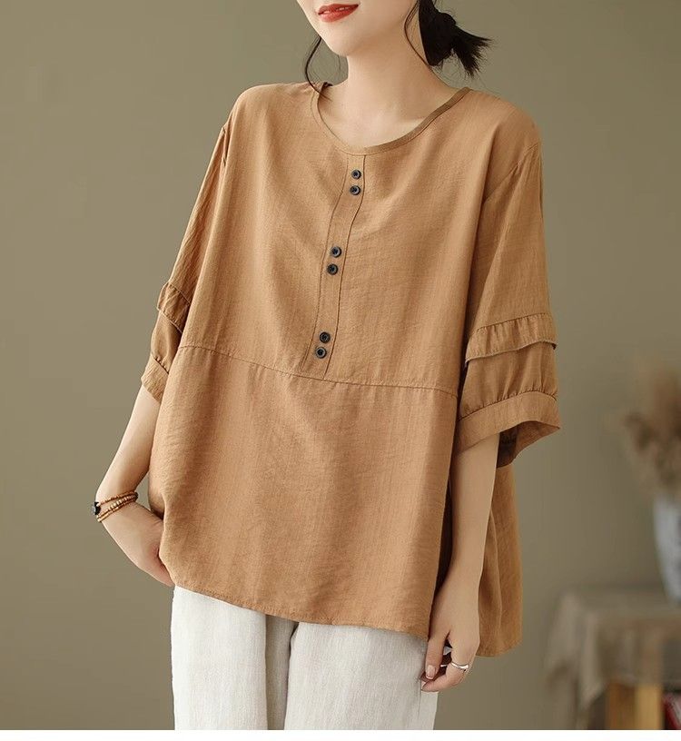 立體寬鬆顯瘦圓領排扣小衫【卡其色】兩件(到手兩件,每件均價499元)