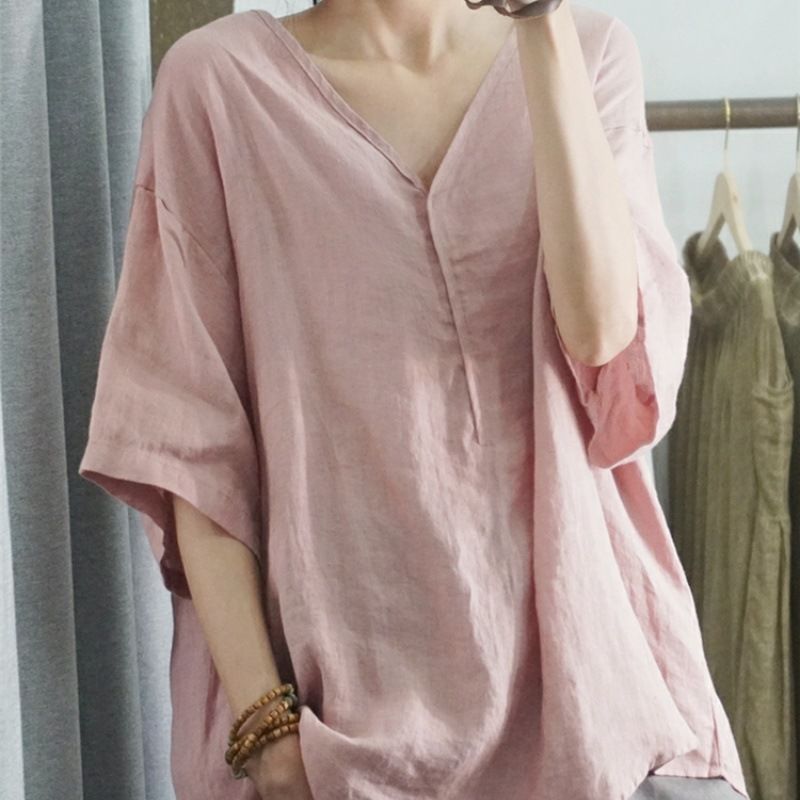 半袖棉麻休閒上衣【粉色】+【白色】各一件(到手兩件,每件均價499元)