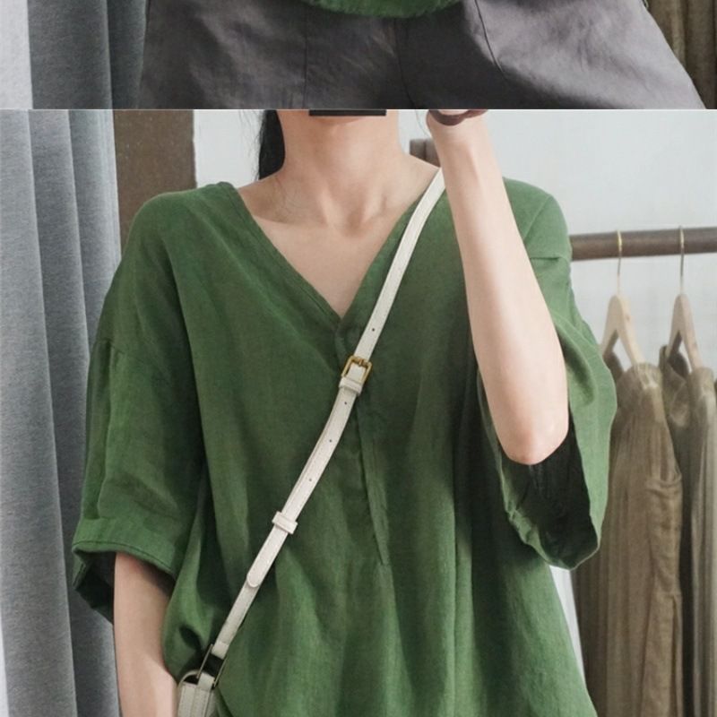 半袖棉麻休閒上衣【綠色】+【杏色】各一件(到手兩件,每件均價499元)