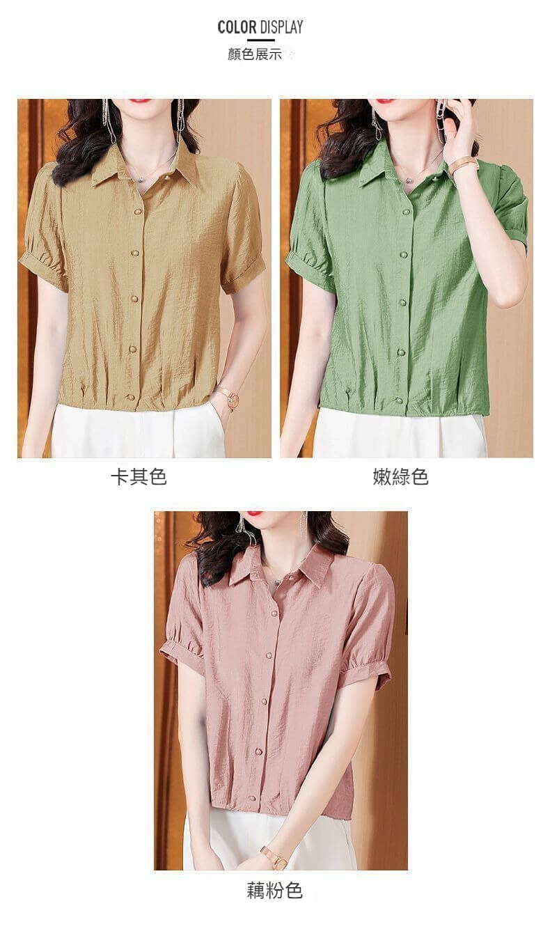 時尚顯瘦洋氣棉麻純色短袖襯衫【買一送一】【卡其色】+【綠色】各一件(到手兩件,每件均價549元!)