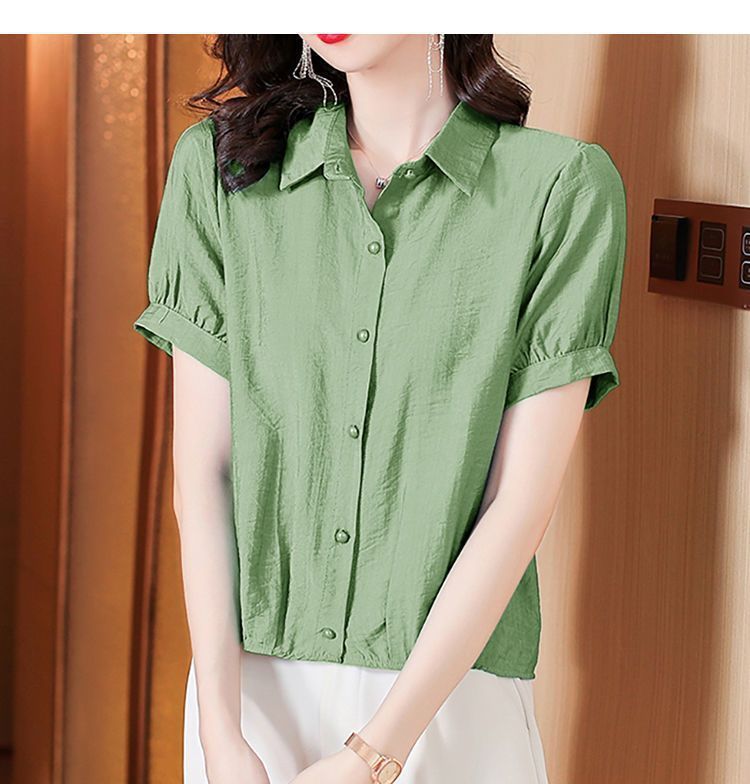 時尚顯瘦洋氣棉麻純色短袖襯衫【買一送一】【綠色】+【粉色】各一件(到手兩件,每件均價549元!)