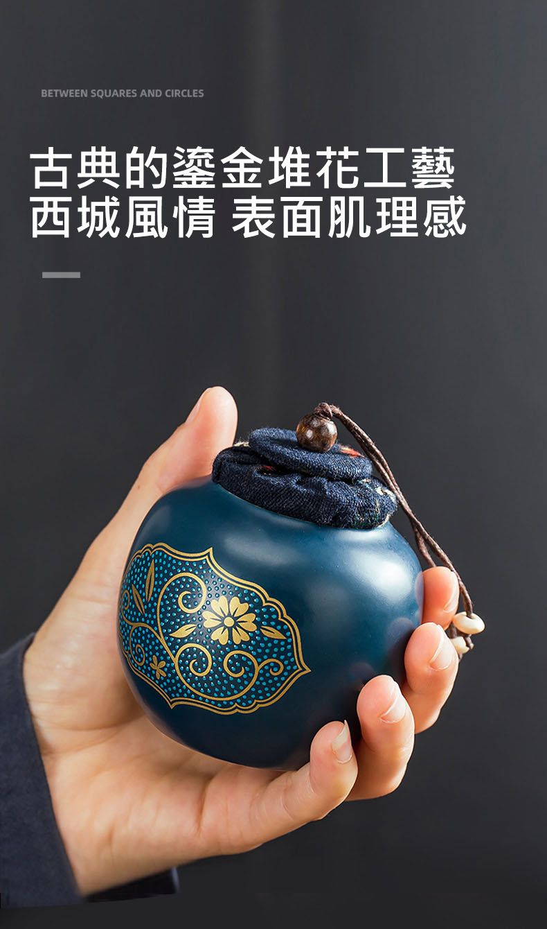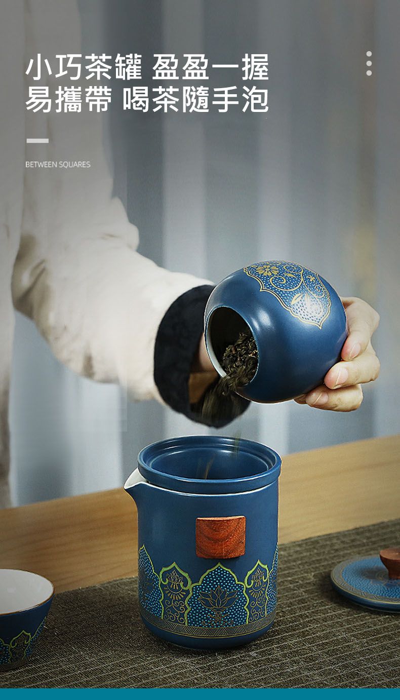 復古茶具套裝【藍色】一組(一壺三杯+茶葉罐+手提皮包)