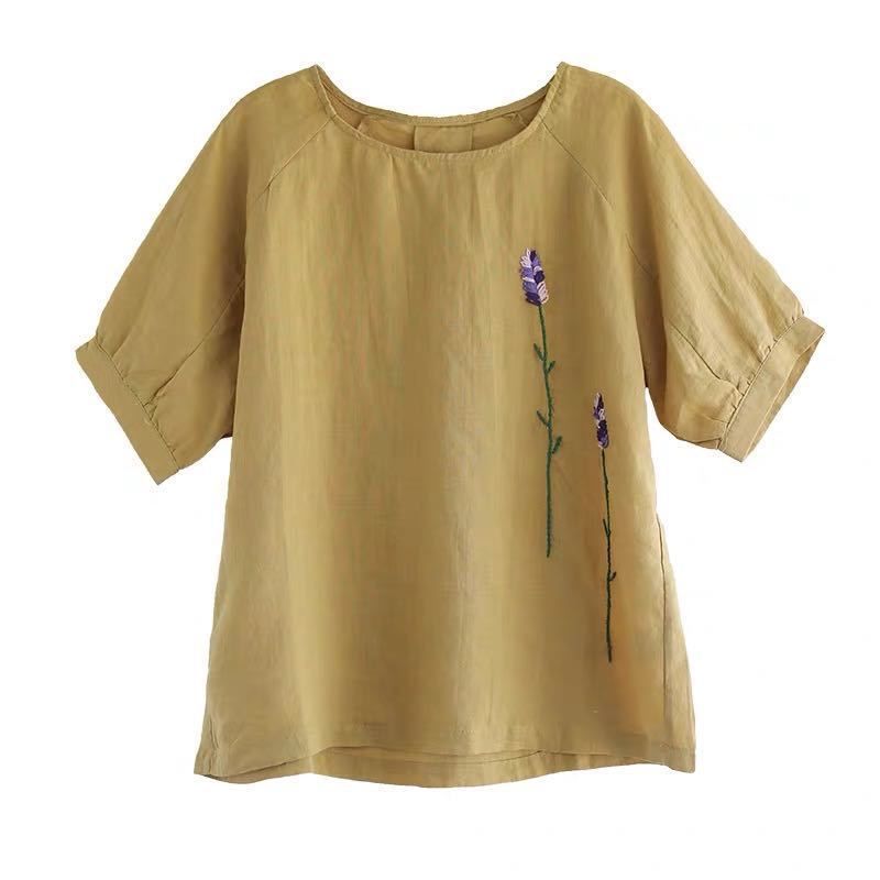 花朵刺繡棉麻T恤【秒殺4件】紫色+黃色各兩件(每件399元)