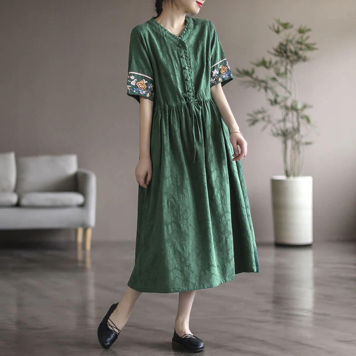收腰抽繩顯瘦棉麻中長款連衣裙【綠色】一件
