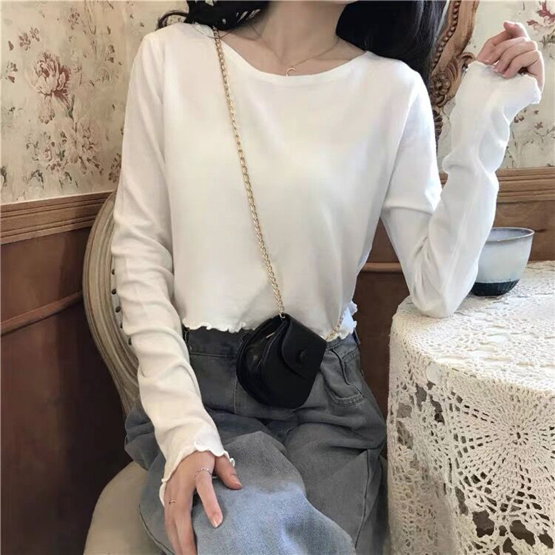 木耳邊韓版修身高彈長袖上衣【買一送一】白色+黑色各一件(到手2件!每件均價400元!)